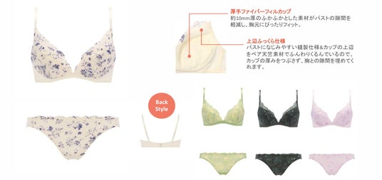 胸元のパカパカ隙間を軽減する「胸元ぴったりブラ」とふわっと軽やかな着けごこちの「らくふわノンワイヤー」の2タイプ