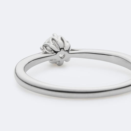 横から見ると可憐なハートでセンターダイヤモンドを取り巻いた愛らしいデザインのエンゲージメントリング。