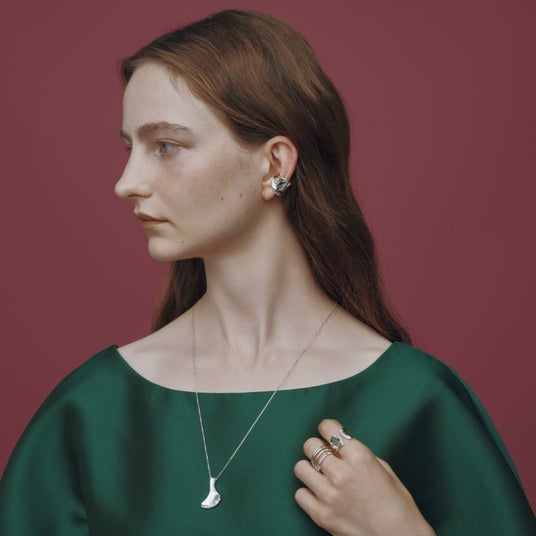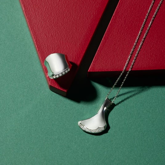 神秘的な薔薇の輪郭をなぞるようにデザインされた地金感たっぷりのイヤーカフと、ひとひらの花びらのように仕立てたモダンなネックレス。