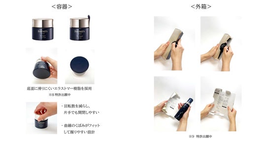 容器・外箱は、障がいがあり、指先に力が入りにくい方などの実際の声を形にし、すべての人が負担なく毎日使用できるよう、「使いやすさ」を徹底的に追求したユニバーサルデザインです。美容液とジェルクリームの容器底面には、滑りにくいエラストマー樹脂を採用し、容器を押さえなくても片手で開閉しやすい設計としました。(特許出願中(※8)) さらに、既存品の半分の回転数で開閉できるネジキャップを採用するなど、身体的な負担を軽減して使用できるように工夫しています。また、外箱は、天面からだけでなく、側面からも開けられる仕様にすることで、容器が横から取り出しやすい設計を採用しました。(特許出願中(※9)) 箱の内側には、見やすい大きさで商品情報やイラストを用いたお手入れ方法等を記載しています。外箱の表示も既存品より大きく表示し、視認性を高めました。