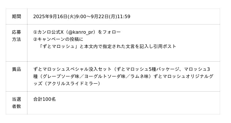 「マロッシュ」と「ずっと真夜中でいいのに。」のコラボレーションを記念し、カンロ公式X(@kanro_pr)でプレゼントキャンペーンを実施します。下記方法によりご応募いただいた方の中から、ずとマロッシュオリジナルグッズやマロッシュなどがセットになった「ずとマロッシュスペシャル没入セット」を抽選で合計100名様にプレゼントします。