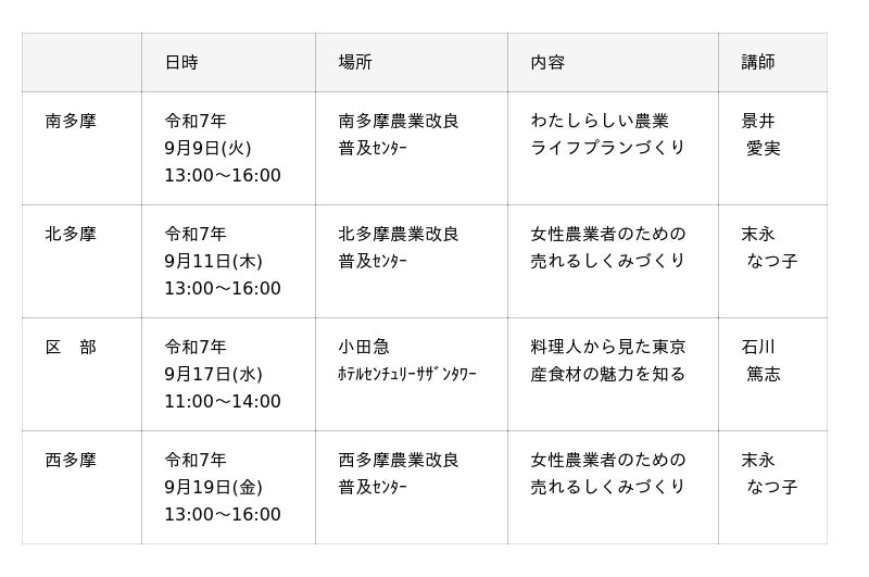 区部、西多摩、南多摩、北多摩の4地域を対象とする「地域講座」を各地域5回、東京都全域の女性農業者を対象として「共通視察」を1回、「フォーラム」を1回、開催予定です。
