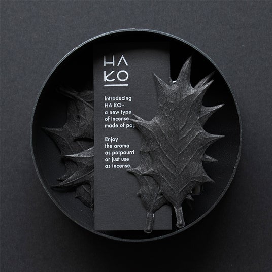 都市部の若者向けに、日本の「香」の歴史発祥の地とされる淡路島に1893年(明治26年)創業した薫寿堂が「HA KO」を生み出しました。薫寿堂が特許を取得した歴史あるお線香とお香の製法を用い、職人の手作業で一枚一枚大切に造っています。お香として焚くと、空間全体に香りが行き渡ります。葉っぱをモチーフにした繊細なデザインはインテリアとして置いて飾るだけでも美しく、気に入った形の葉っぱを拾って家に持って帰り、玄関先にそっと置いておくような気軽な気持ちで、生活に香りを取り入れてもらえるよう願いが込められています。