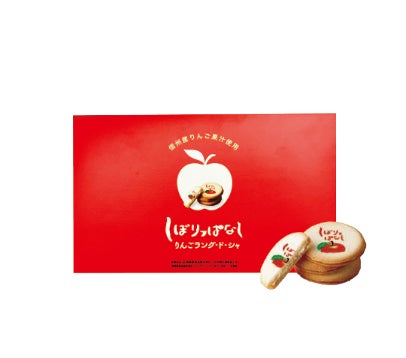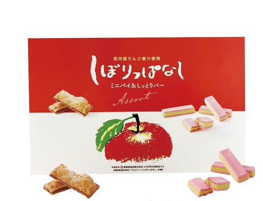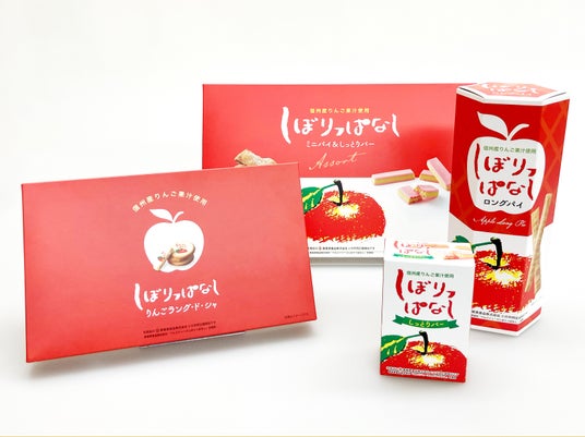 壽高原食品株式会社「信州産りんごジュース しぼりっぱなし」を使用した、左から「ラング・ド・シャ」「ミニパイ&しっとりバー」「しっとりバー」「ロングパイ」の4商品。