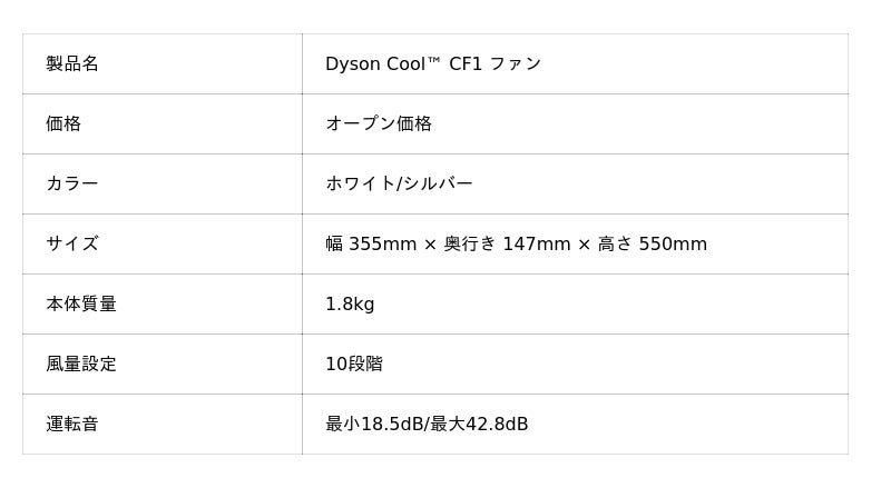 Dyson Cool(TM) CF1 ファン:https://www.dyson.co.jp/air-treatment/fans-heaters/cool-cf1/white-silver