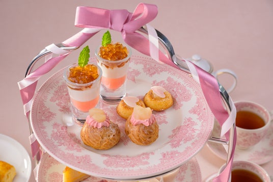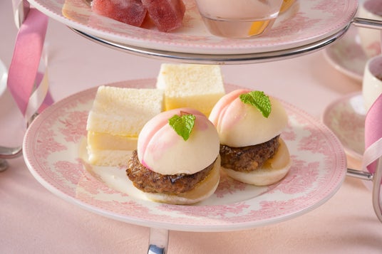 セイボリーには、三重県産美熊野牛を桃の形をしたバンズに挟んだミニバーガー、桃のフルーツサンド、そしてほんのりとした甘さが魅力の桃のビシソワーズを取りそろえています。なめらかな口当たりの桃のビシソワーズは、ご賞味いただきたい一品です。さらにスイーツには、桃の焼ドーナツやプチシューなど桃を使った品々をご堪能いただけます。
