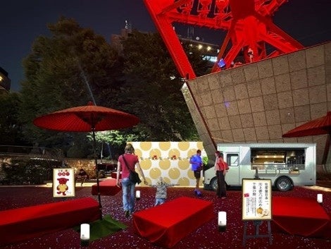 正面玄関前イベントスペース(屋外)に、野立て茶屋風のお月見にピッタリなスペースを設置します。秋満月を使ったスイーツやスムージーをキッチンカーで販売し、産地直送の秋満月即売会のほか、千葉県マスコットキャラクター 「チーバくん」と、東京タワー公式キャラクター「ノッポン兄弟」も登場します。