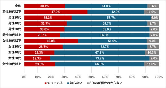 SDGsが「2030年までの目標」であることを知っているか聴取したところ、全体で「知らない」が最多で61.0%、「知っている」は30.4%、「SDGsが何か分からない」は8.6%となった。性年代別で見ると、「知っている」と回答した割合が最も高いのは男性20代以下で47.0%だった。「知らない」と回答した割合が最も高いのは女性50代で73.7%だった。