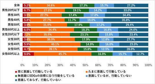 「常に意識して行動している」「たまに意識して行動している」「無意識にSDGsを意識して行動している」の合計は57.1%で、半数以上が何らかの形でSDGsに沿った行動をしていることが明らかになった。また「意識しているが行動はしていない」と回答した人は15.7%で、SDGsへの関心はあるものの、実際の行動に結びついていない層の存在も見て取れた。