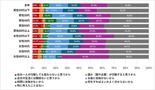 性年代別で見ると、「特に考えたことがない」は男性20代以下の割合が最も高く、全体よりも9.4ポイント高い53.2%だった。また「何をすればよいかよく分からないから」は女性60代以上の割合が最も高く、全体よりも20ポイント高い47.4%だった。