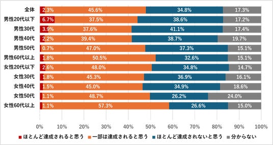 SDGsを認識している人を対象に、2030年までにSDGsの目標を達成できると思うか聴取した。「一部は達成されると思う」が最多で45.6%、次いで「ほとんど達成されないと思う」が34.8%だった。最も少なかったのは「ほとんど達成されると思う」で2.3%だった。「一部は達成されると思う」の割合が最も多い年代は女性60代以上で57.3%だった。