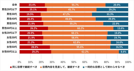 性年代別で見ると、「一時的な目標として終わらせるべき」の割合が最も高かった男性30代が33.3%で、最も低い女性60代以上と比較すると、24.7ポイントの差があった。