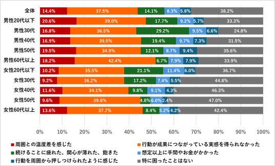 性年代別で見ると、「特に困ったことはない」の割合がすべての年代で女性の方が高く、男性よりも前向きに取り組んでいることが伺える。また「続けることに疲れた、関心が薄れた、飽きた」の割合が最も高い男性30代は29.2%と全体から15.1ポイント高かった。