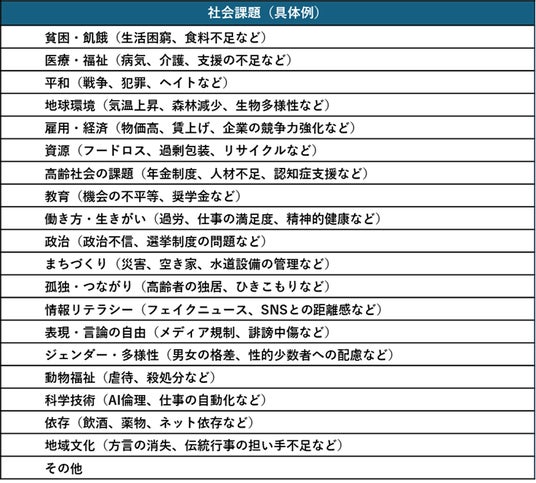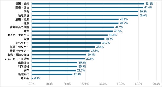 重視すべき課題を複数回答で聴取した結果は、「貧困・飢餓」が最多で、回答した人の割合は63.1%だった。次いで、「医療・福祉」が62.4%、「平和」が59.8%だった。最も回答が少なかった「地域文化」でも22.8%となり、幅広い社会課題に関心が集まっていることが伺える。