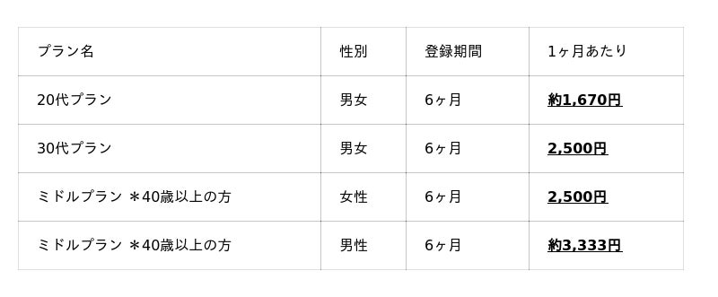 ・20代(男女共通):6ヶ月 10,000円(1ヶ月あたり約1,670円)