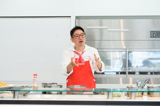 休憩を挟み、料理芸人のクック井上。さんが考案したアレンジレシピのレクチャー会がスタートしました。無収入の芸人時代から支えてくれた奥様に「作るごはんがおいしいから結婚したい」と言わせたほどの腕前の持ち主であるクック井上。さん。料理の原動力は「家族にモテたい」という気持ちだそうで、今回のレシピも「パートナーや友だちに出したときに“気が利いてるじゃん”と言ってもらえる、でも手間はかからない」という、ギリギリのラインを攻めたと熱く語ってくださいました。