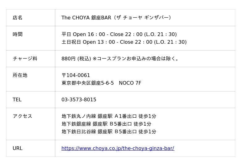 The CHOYA 銀座BARでは、お客様に「常に梅との新しい出会い」をお届けする事をコンセプトにこれからも運営して参ります。梅気分の際には、お気軽にお立ち寄りください。