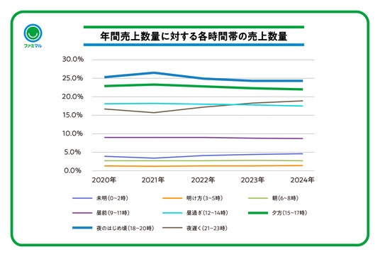 ファミマルアイスの購入時間帯について、過去5年間(2020年1月1日~2024年12月31日)で最も購入されているのは「夜のはじめ頃(18~20時)」であることがわかりました。加えて、「夜遅く(21~23時)」の時間帯についても増加傾向にあり、夜帯がアイスを購入するピーク時間になっています。1日の締めとして「〇〇おわり・あがり」のアイスを楽しんでいる可能性が見られました。