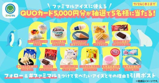 ファミリーマート公式X(@famima_now)をフォローのうえ、ファミリーマート公式Xからの対象の投稿に「#ファミマル」とつけて、食べたいアイスとその理由を引用ポストしていただくと、抽選で5名さまにQUOカード5,000円分が当たります。