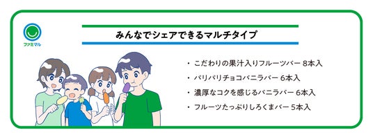 今年もファミマルは、「こだわりの果汁入りフルーツバー」や「パリパリチョコバニラバー」、「濃厚なコクを感じるバニラバー」、「フルーツたっぷりしろくまバー」などマルチタイプのアイスを多く取り揃えています。家族とも友達とも仲良く手軽に、本数が多くおトク感があるアイス商品を楽しめます。