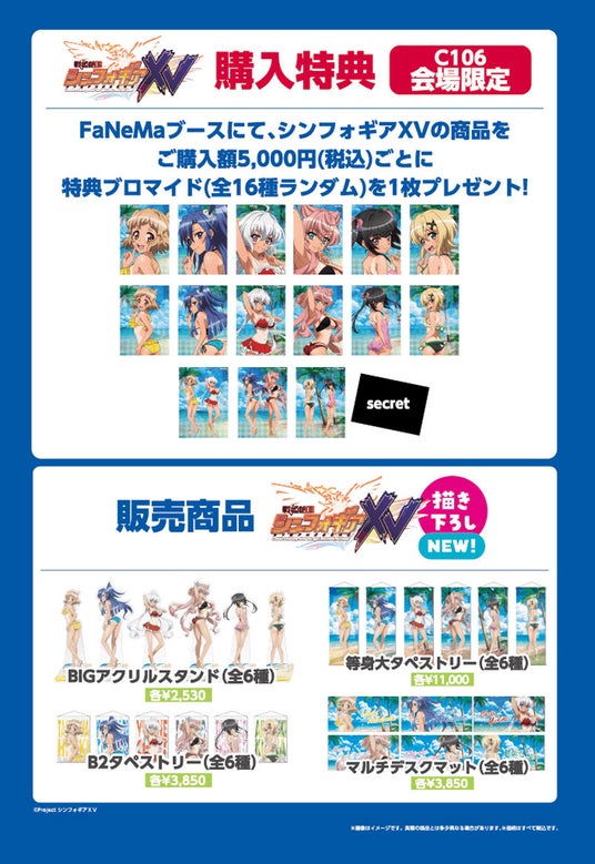 システムサービス株式会社(本社:東京都豊島区、代表取締役社長:田村宗弘)は、アニメ・マンガ・ゲーム作品等のキャラクター商品の企画・製作・販売をする自社ECサイト「FaNeMa」(URL:https://fanema.jp/)ブランドにて、2025年8月16日(土)・8月17日(日)に開催される「コミックマーケット106」に出展し、TVアニメ『戦姫絶唱シンフォギアXV』より新規描き下ろしイラストを使用した「BIGアクリルスタンド」「B2タペストリー」「等身大タペストリー」「マルチデスクマット」を発売いたします。