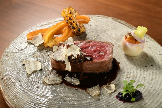 はこだて牛のサーロインのポワレ スイートコーンのチュロス あやめ蕪のファルス