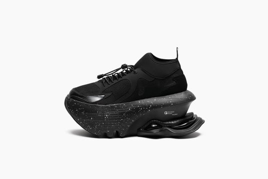 SKYSCRAPER LAND SPEEDERは、SF映画に登場するモビリティをイメージしたモデル。ハイスピードで空を割くメカを着想源に、メッシュのパネルとなめらかな曲線のCPUパーツを組み合わせたアッパーと、精密なメカを想起させるボトムパーツ「FALCON」を組み合わせ、近未来感溢れるスタイルに。