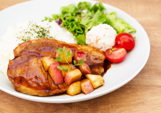 りんごと豚肉を甘酸っぱいバルサミコソースで仕上げたライスプレートです。