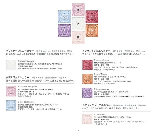 JILL STUARTが特別な年に贈る、まるで宝石のような輝きを放つオールジュエルカラーのアイカラー。4種類の異なる発色、輝き、質感を詰め込んだ7色のパレットです。A色は、透明感と虹色の輝きをもつ超大粒ラメを高配合したグリッタージュエルカラー。角度によって輝きが変化し、ダイヤモンドのように贅沢にきらめきます。ベースには、のびのよさと密着力に優れた2種のオイルを配合。なめらかにのび広がりながらも、肌にぴたっと密着し、動きの多いまぶたの上でもラメ落ちしにくいカラーです。B・G色、C・D・F色には、高輝度パールをふんだんに配合。それぞれのパールがにごらずに美しく輝く比率を見出しました。すべての粉体をしっとりとした油分でコーティングすることで、乾燥感や、パール・粉飛びをおさえています。E色は、繊細な輝きを宿すシマリングジュエルカラー。アイカラーとしてだけでなく、頬の高い位置や鼻筋などに、ハイライトとしてご使用いただくのもおすすめです。単体でのご使用はもちろん、お手もちのアイカラーに重ねてニュアンスチェンジも可能。いつものアイカラーに特別なきらめきをプラスできます。