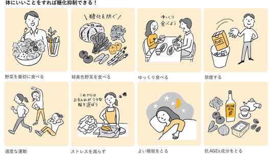 栄養と食事を通じた疲労の抑え方は、大きく分けて2つ。1つはカロリー制限と運動、もう1つは糖化抑制です。