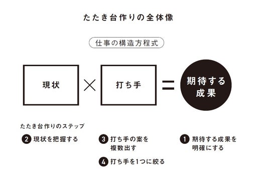 仕事の構造は「現状×打ち手=期待する成果」という方程式で表せます 。動かせない「定数(現状、期待する成果)」を固め、その後に「変数(打ち手)」を求めるという手順を踏むことで、入社1年目からでも、仕事の構造に沿った、たたき台を作ることができます。