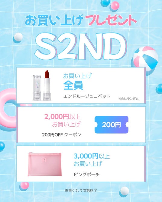 S2ND Qoo10メガ割ではお買い上げプレゼントもあり価格によって多様なプレゼントがもらえます。S2NDのQoo10公式ショップでは08月31日(日)~09月12日(金)までの期間限定で最大60%OFF、またS2ND楽天公式ショップでも09月04日(木)20:00 ~ 06月11日(木)01:59までの期間限定で最大50%OF+10倍ポイントをもらえる企画を開催するので、この企画をお見逃しなく。