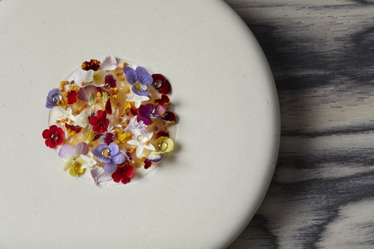 カオス理論SOAで作ったチーズの上にエディブルフラワーとハチミツ、花粉を飾り、花と蜂の関係を表現した一品。