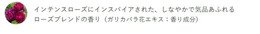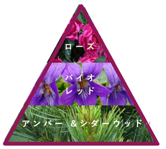 ベースにはアンバーとセダールウッド、ミドルにバイオレット、トップにローズの設計で、香りを通しインテンスローズのイメージをご体感いただけます。