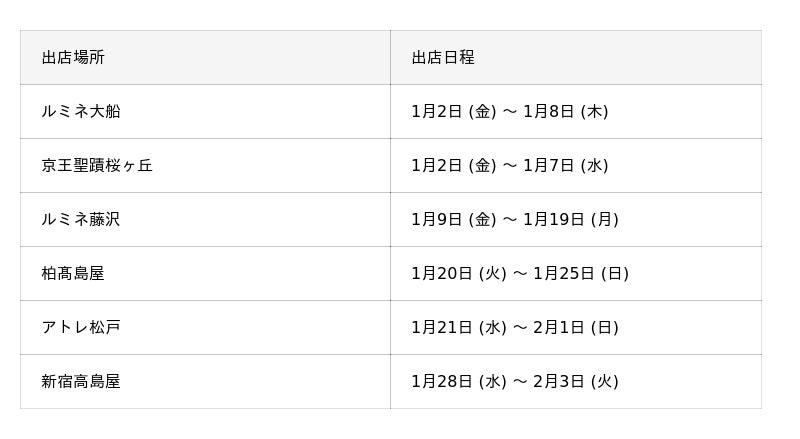 ※営業日程・時間は催事場によって異なります。各施設のホームページ等をご確認ください。