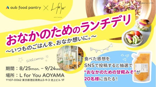 腸ケア商品を開発・販売するAuB(オーブ)(株)(東京、代表取締役 鈴木啓太)は、オーガニックフード中心の美腸活カフェ 「L for You AOAYAMA」(東京、港区)とコレボレーションし、8月25日(月)から9月24日(水)の期間限定で「おなかのためのランチデリ~いつものごはんを、おなか想いに。~」プレートを提供します。また、来店後にSNSでレポート投稿した方の中から抽選で20名に「おなかのための甘糀みそ」をプレゼントするキャンペーンも実施します。
