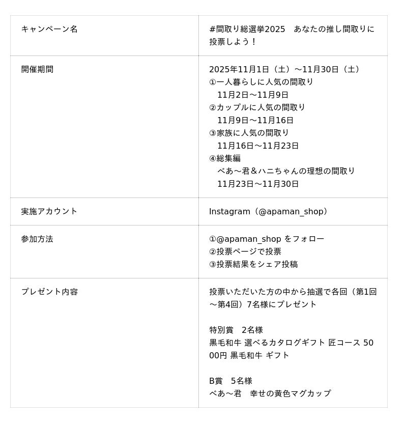 ・本キャンペーンは、APAMAN株式会社(以下「当社」といいます)が主催する「#間取り総選挙2025」Instagramキャンペーンです。