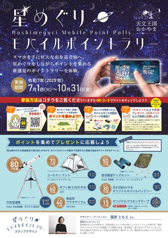 「天文王国おかやま」誘客促進協議会は、岡山県内にある天文関連施設の認知拡大と誘客を図る事を目的とし、2025年7月1日(火)~2025年10月31日(金)の期間、「星めぐりモバイルポイントラリー」を開催します。