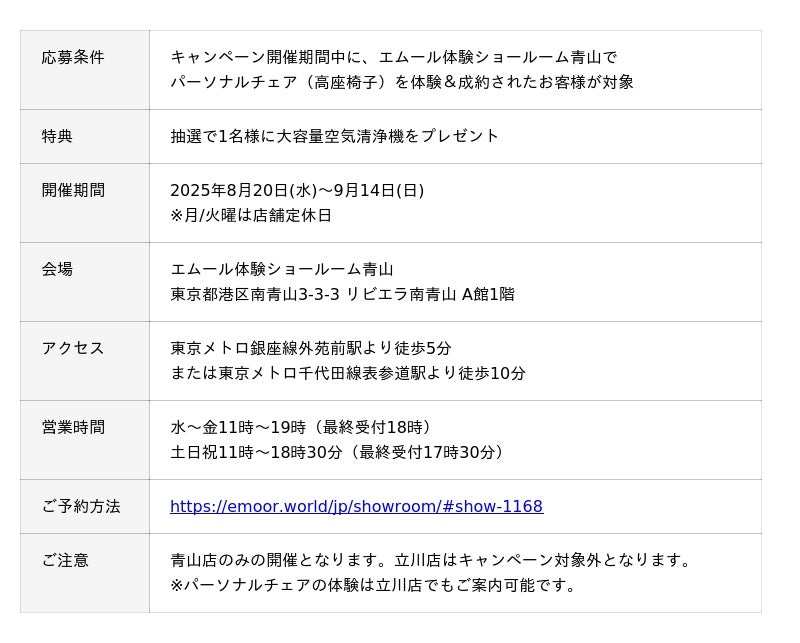 「身体に合った寝る・座る・たたむ」を提供する健康家具ブランドEMOORを展開する株式会社エムール(東京都立川市:代表取締役 高橋 幸司/以下エムール)は、2025年8月20日~9月14日の期間中、青山体験ショールーム(東京都港区青山3-3-3 リビエラ南青山A館1階)で「パーソナルチェア体験&特典キャンペーン」を開催します。