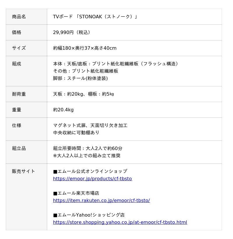 「身体に合った寝る・座る・たたむ」を提供する健康家具ブランドEMOORを展開する株式会社エムール(東京都立川市:代表取締役 高橋 幸司/以下エムール)は、2025年11月3日より「TVボード STONOAK(ストノーク)」の販売を開始しました。