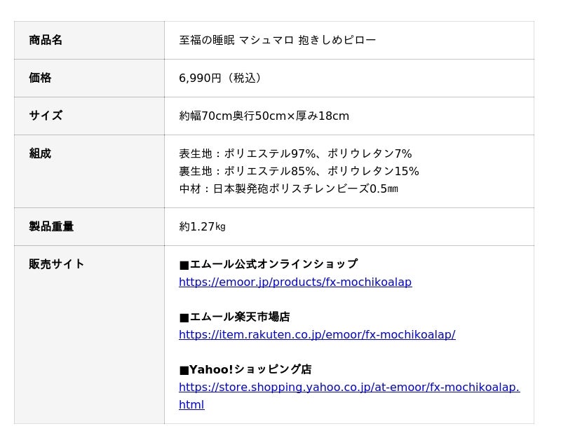 「寝る・座る・たたむ」に専門性をもつ健康家具ブランドEMOORを展開する株式会社エムール(東京都立川市:代表取締役 高橋 幸司/以下エムール)は、2025年12月3日より、抱きしめることで心がゆるむ、やさしいフィット感を追求したクッション『至福の睡眠 マシュマロ 抱きしめピロー』の販売を開始しました。国産ビーズをたっぷり使ったもちもちの触感と、抱きつきやすいクロス型デザインが魅力です。