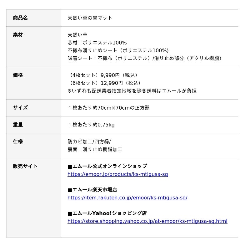 「寝る、座る、たたむ」に専門性を持った健康家具ブランドEMOORを展開する株式会社エムール(東京都立川市:代表取締役 高橋 幸司)は、2026年3月13日より、用途や間取りに合わせて自由にレイアウトできる『天然い草の畳マット(以下、畳マット)』の販売を開始しました。