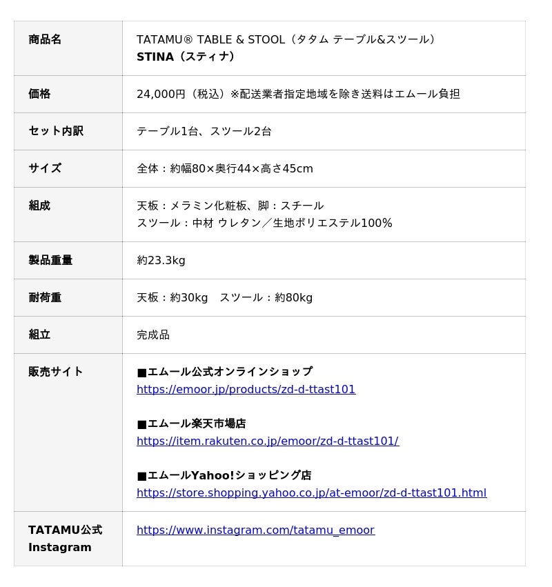 人間工学に基づいた空間有用性と安全な使い心地を両立するトランスフォーム家具ブランドTATAMU(R)を展開する株式会社エムール(東京都立川市:代表取締役 高橋 幸司)は、2026年4月7日より、テーブル&スツール『STINA』(以下、 スティナ)の販売を開始しました。