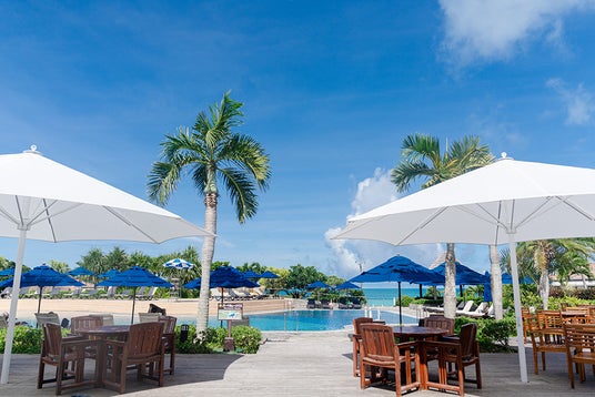 宮古ブルーの海が見えるプールサイドのテラス席でお楽しみいただける「宮古島産 マンゴーパフェ」は、リゾート気分を盛り上げる最高のデザート。