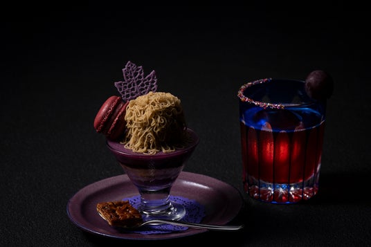 2,900円                              『夢シルク』のクリームで仕上げたパープルが美しいフォトジェニックなモンブラン。パフェグラスの中身には、『夢シルク』のスポンジをベースに、ブルーベリーのコンフィチュールやグリオットのシャンティクリーム、ラムレーズンのアイスクリームと味わい豊かなハーモニー。添えたグリオットのマカロンとフロランタンもご一緒にお楽しみください。