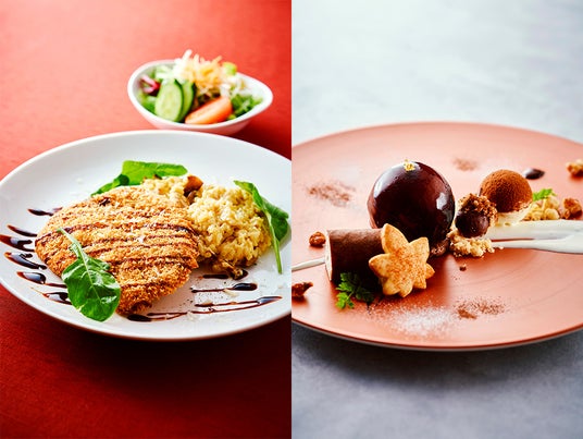 ビーフカツレツ レックコート風&ポルチーニのリゾット(左)とティラミス×ティラミスプレート(右)