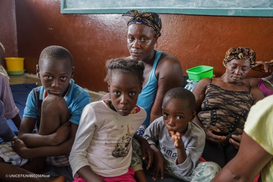 ハリケーン「メリッサ」により自宅が破壊され、学校に避難している家族(ハイチ、2025年10月30日撮影) (C) UNICEF/UNI893256/Noel