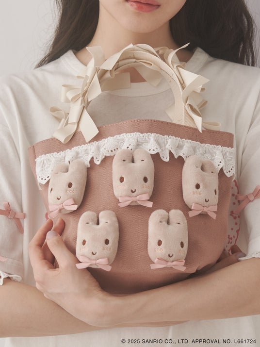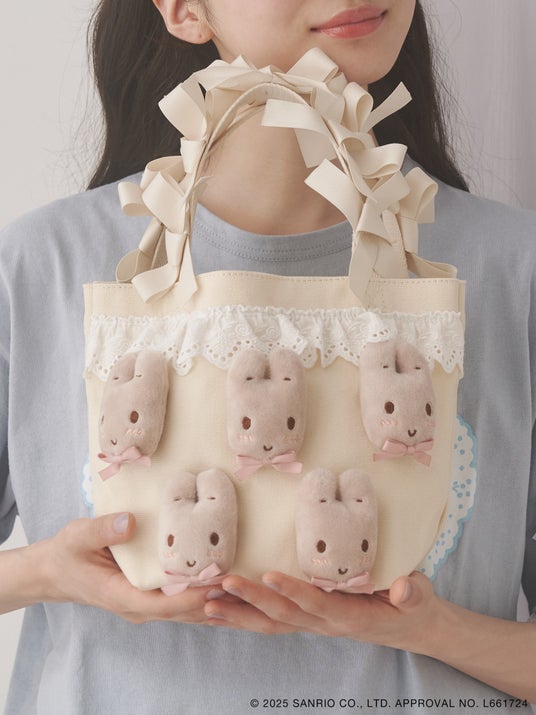 merry jenny定番のぬいぐるみ付きトートバッグは“むぎゅむぎゅ”っとマロンクリームのお顔が並び、持ち手にもリボンがたっぷり施された特別なデザイン。ころんとしたサイズ感も愛らしいアイテムです。