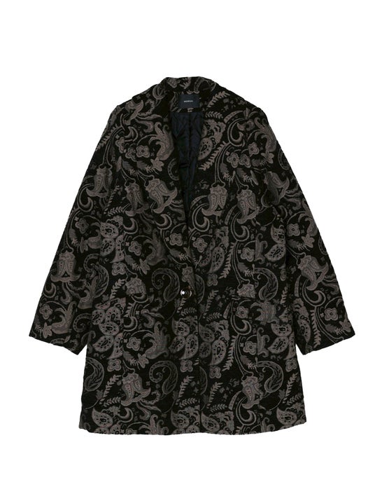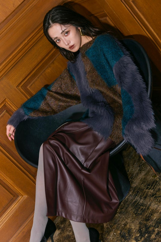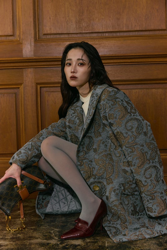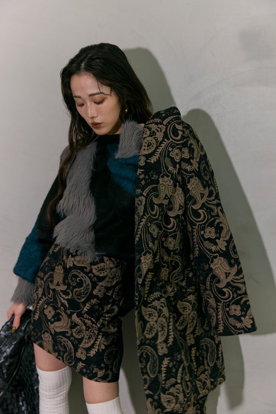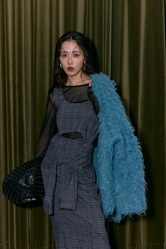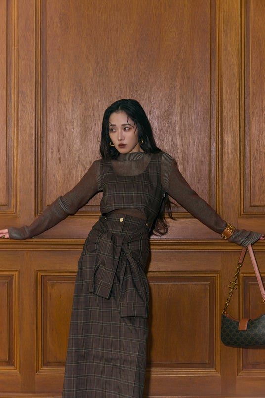ジャケットには裏地に中綿キルティングを施し、ロングシーズンで活躍する仕様に。スカートはバックのレースアップでサイズ調整が可能で美しいジャストシルエットを叶えます。ジャンパースカートはウエスト部分の取り外しによりスカート単体としても着用可能。さらにニットは肩あきのディテールが抜け感を演出しMURUAらしいモード感で、YUKKOさんならではの繊細なデザインが映える一着です。