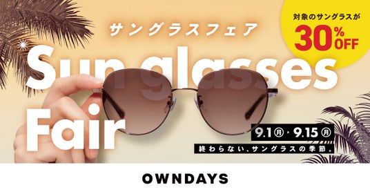 OWNDAYSでは2025年9月1日(月)から9月15日(月)まで、対象のサングラスが30%OFFとなるお得な「サングラスフェア」を全国の店舗・オンラインストアで開催いたします。今季の新作を含め、紫外線99%以上カットの機能的なサングラスを豊富に取り揃えております。厳しい残暑が予想される9月のお出かけ、秋の行楽シーズンのドライブやレジャーなど、サングラスが活躍するシーンはまだまだ続きます。このお得な機会に、本格的なサングラスで「目」のUV対策を始めてみませんか?